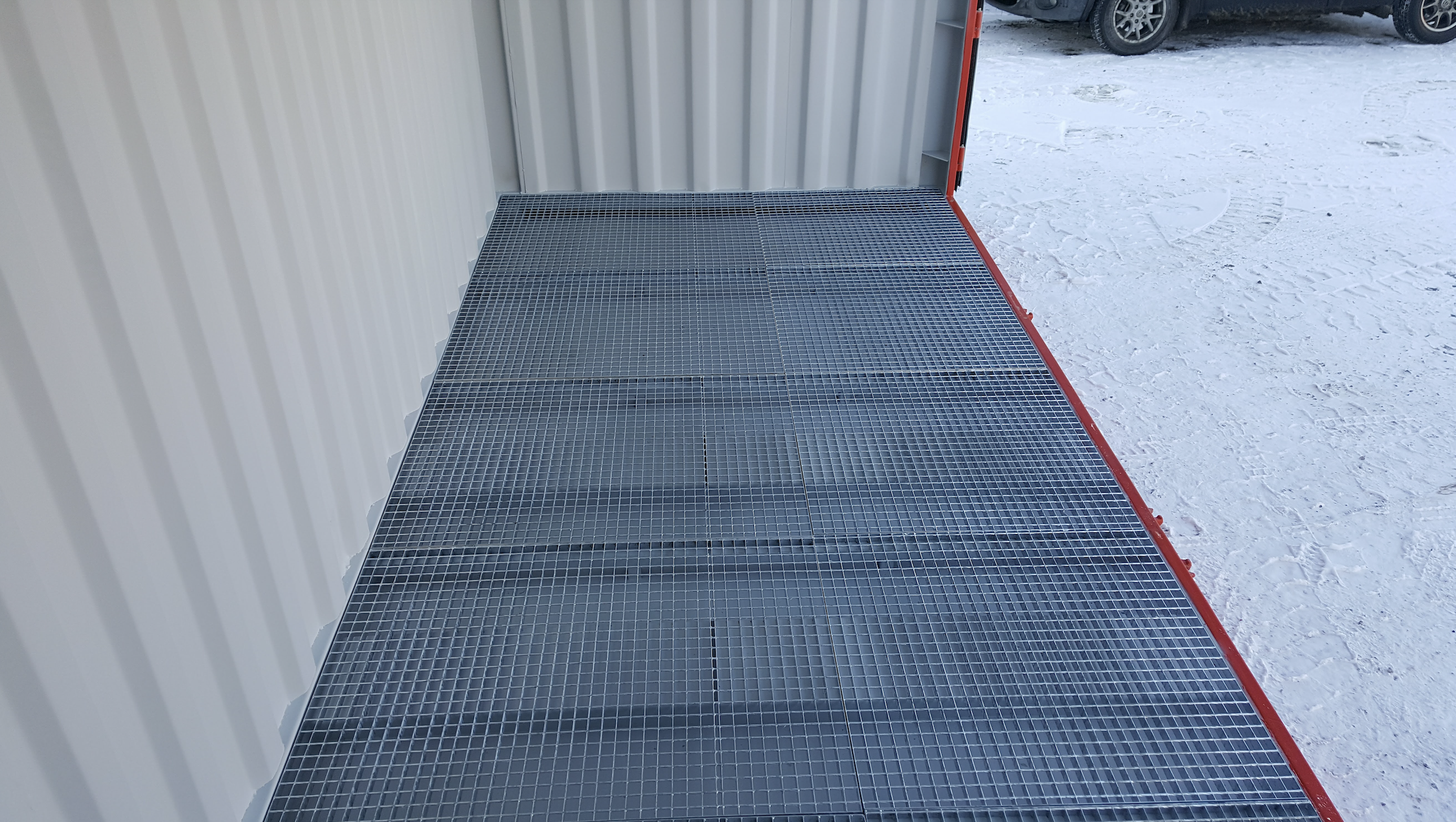 Alle miljøcontainerne til RCONTAINER® kommer fullt utstyrt med varmgalvanisert gittergulv og oppsamlingskar i tilfelle lekkasjer. Oppsamlingskaret gjør det svært enkelt å åpne opp og suge ut avfall som samler seg opp. Tommelfingerregelen som gjelder her, er at oppsamlingskaret skal minimum kunne ta opp den største enheten som lagres + 10%. Containerne har også mekanisk utlufting i taket, tre hyller sveiset til veggen og en innfelt A60 galvanisert dør. Utenom dette kan vi tilpasse dem i det uendelige. Vi kan blant annet levere miljøcontainere med brannisolasjon og annen innredning eller lyssetting. Uansett hvilke tilpassinger du måtte ønske vil alle ombygginger bli utført i vårt verksted på Oppaker, og vi sørger for 3 års garanti på tilpassede containere.
